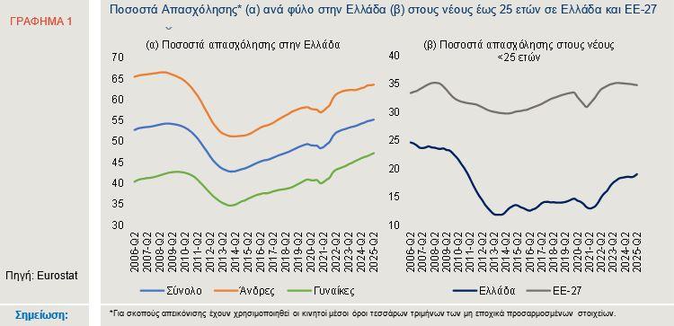 Δεύτερον, το χαμηλότερο ποσοστό συμμετοχής στο εργατικό δυναμικό στην Ελλάδα. γεγονός που οδηγεί, σε συνδυασμό με τη συγκριτικά υψηλή ανεργία, σε χαμηλότερο ποσοστό απασχόλησης σε σύγκριση με τον ευρωπαϊκό μέσο όρο (2025-Q2: Ελλάδα: 56,4%, ΕΕ-27: 62,1%), ιδιαίτερα στις γυναίκες και στους νέους, παρά τη σαφή πρόοδο που έχει επιτευχθεί και αντανακλάται στην άνοδο του εν λόγω ποσοστού το δεύτερο τρίμηνο σε ιστορικά υψηλά επίπεδα.