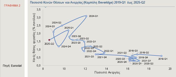 Στο Γράφημα 2 παρουσιάζεται η καμπύλη Beveridge για την αγορά εργασίας στην Ελλάδα, από το πρώτο τρίμηνο του 2019 έως το δεύτερο τρίμηνο του 2025. Η καμπύλη αυτή αποτυπώνει την αρνητική συσχέτιση μεταξύ (α) του ποσοστού των κενών θέσεων εργασίας, το οποίο αποτελεί δείκτη ζήτησης εργασίας από τις επιχειρήσεις και (β) του ποσοστού της ανεργίας. Οι κινήσεις κατά μήκος της καμπύλης σχετίζονται με τις κυκλικές διακυμάνσεις της οικονομίας. Για παράδειγμα, κατά τη διάρκεια των υφέσεων, υπάρχουν συνήθως λίγες κενές θέσεις και υψηλή ανεργία, ενώ, κατά τη διάρκεια της επεκτατικής φάσης του οικονομικού κύκλου, προσφέρονται περισσότερες θέσεις εργασίας, με συνέπεια τη μείωση της ανεργίας.