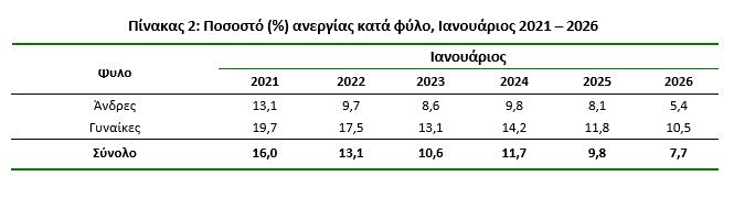 Οι άνεργοι ανήλθαν σε 369.146 άτομα σημειώνοντας μείωση κατά 92.711 άτομα σε σχέση με τον Ιανουάριο του 2025 (-20,1%) και μείωση κατά 3.907 άτομα σε σχέση με τον Δεκέμβριο του 2025 (-1,0%).