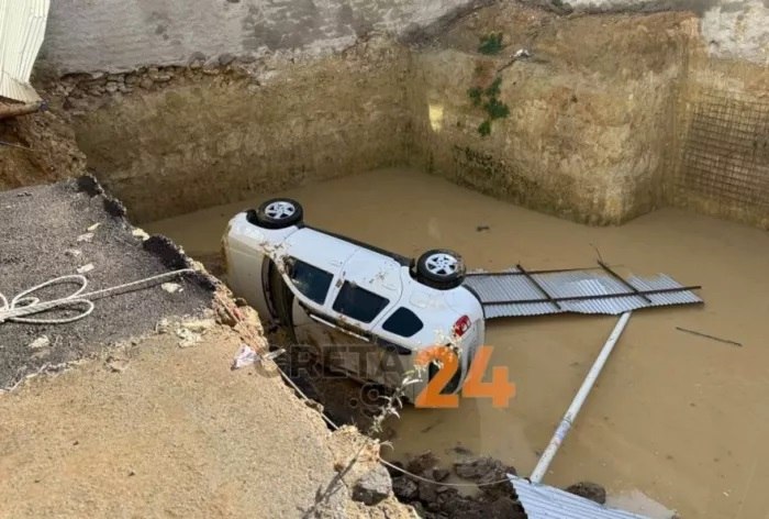 Στο Ηράκλειο, οι ισχυρές βροχές προκάλεσαν σοβαρές ζημιές. Το οδόστρωμα κατάπιε ένα σταθμευμένο αυτοκίνητο στην οδό Φωτάκη, όταν υποχώρησε τμήμα του δρόμου δίπλα σε εργοτάξιο θεμελίωσης.
