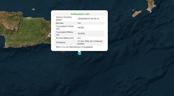 Ισχυρόςσεισμόςμεγέθους 4,6 Ρίχτερ σημειώθηκε το πρωί τηςΚυριακής,στις10:04,κοντά στο ΓουδουράΛασιθίου.
