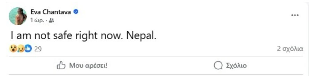 H Εύα Χαντάβα παραμένει εγκλωβισμένη στην πόλη, με τις πτήσεις να ακυρώνονται και την κατάσταση να χαρακτηρίζεται ασταθής και επικίνδυνη. H ίδια μέσω ανάρτησής της στο Facebook, ενημέρωσε τους φίλους και θαυμαστές της ότι είναι καλά στην υγεία της, αλλά δεν μπορεί να φύγει από τη χώρα όσο η κατάσταση δεν ομαλοποιείται.