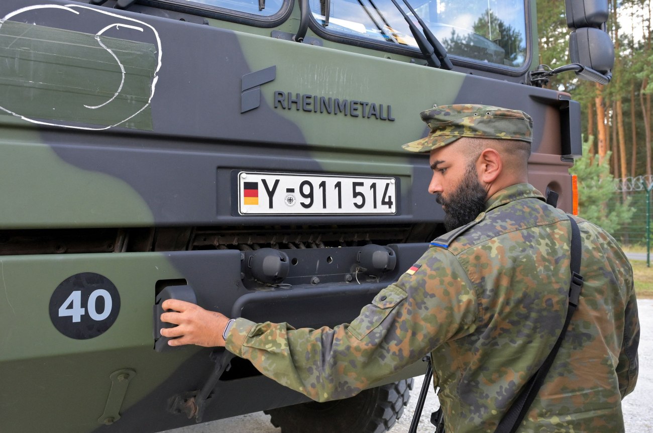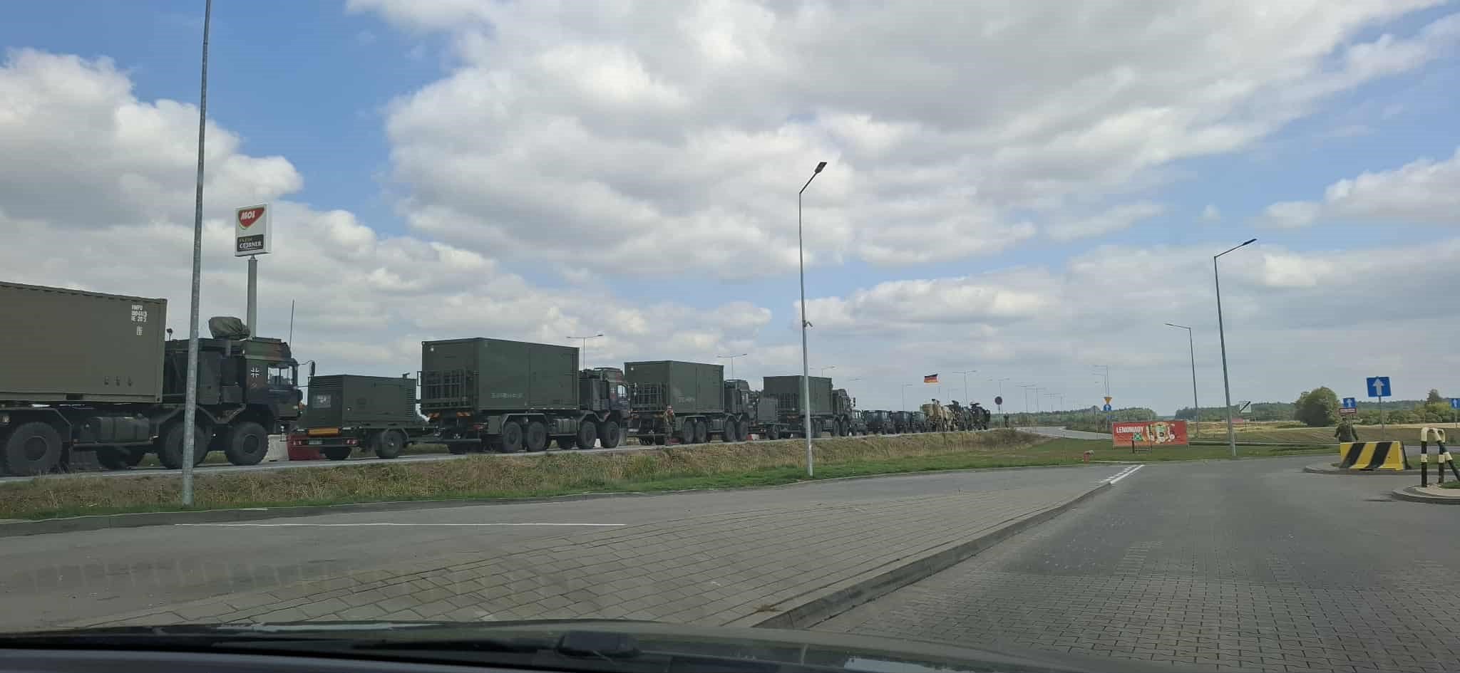 Γερμανικά στρατιωτικά οχήματα κινούνταν τη Δευτέρα 8 Σεπτεμβρίου από τη Βαρσοβία της Πολωνίας προς το Βίλνιους της Λιθουανίας για την άσκηση Quadriga 2025 . Έφεραν γερμανικές σημαίες και σημαίες της ΕΕ που δεν είναι εμφανείς.