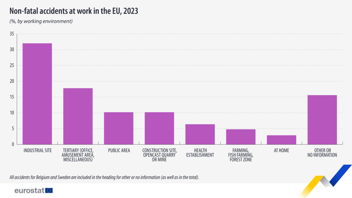 Όσον αφορά τα μη θανατηφόρα εργατικά ατυχήματα στην ΕΕ, το 2023 το υψηλότερο ποσοστό σημειώθηκε σε βιομηχανικούς χώρους (32,0%), ενώ ακολούθησε ο τριτογενής τομέας (17,8%), σε χώρους όπως είναι τα γραφεία.