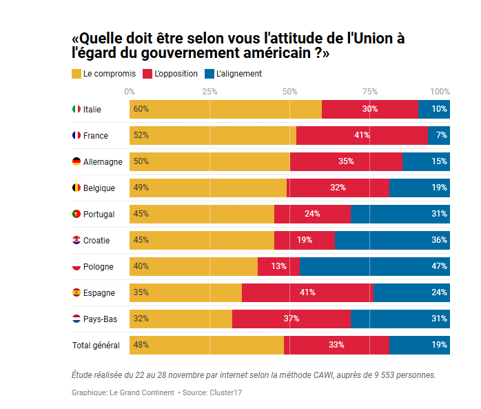 Αναφορικά με τις σχέσεις με την αμερικανική κυβέρνηση οι περισσότεροι απαντούν ότι το καλύτερο είναι η Ευρώπη να επιδιώξει τον συμβιβασμό, αν και η επιλογή της σύγκρουσης εμφανίζεται ενισχυμένη ιδίως στη Γαλλία, την Ισπανία και την Ολλανδία.