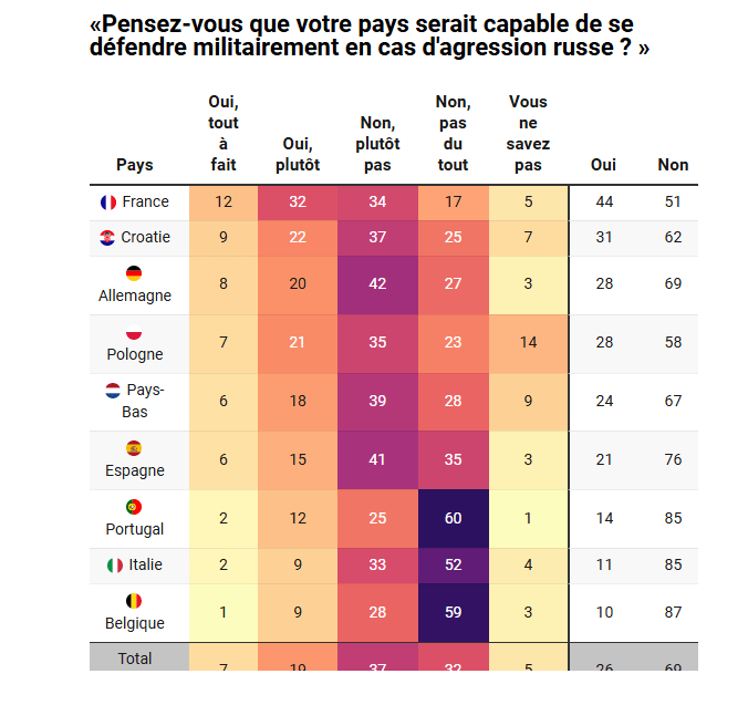 Η εμπιστοσύνη στις εθνικές στρατιωτικές ικανότητες είναι χαμηλή σε όλα τα ευρωπαϊκά κράτη που συμμετείχαν στην έρευνα, με το 69% των ερωτηθέντων στις εννέα χώρες να λένε ότι πιστεύουν πως η χώρα τους δεν είναι πραγματικά ή καθόλου ικανή να αμυνθεί απέναντι στη ρωσική επιθετικότητα.