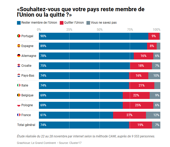 Η δέσμευση για ένταξη στην ΕΕ παραμένει δημοφιλής: το 74% των ερωτηθέντων θέλει η χώρα τους να παραμείνει στο μπλοκ, ενώ το 19% προτιμά να φύγει. Η Γαλλία είναι η χώρα όπου η επιθυμία για παραμονή στο μπλοκ είναι η πιο αδύναμη, με περισσότερο από το ένα τέταρτο (27%) του πληθυσμού να θέλει να φύγει, ενώ το 12% δηλώνει αναποφάσιστο.