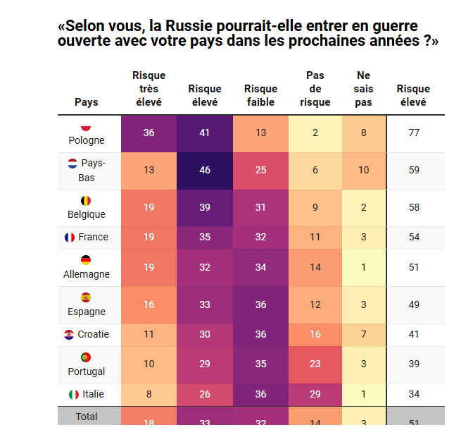Η δημοσκόπηση σε Γαλλία, Ιταλία, Ισπανία, Γερμανία, Πολωνία, Πορτογαλία, Κροατία, Βέλγιο και Ολλανδία διαπίστωσε επίσης ότι μια σχετική πλειοψηφία (51%) πιστεύει ότι ο κίνδυνος ανοιχτού πολέμου με τη Ρωσία τα επόμενα χρόνια είναι υψηλός, με ένα 18% να τον θεωρεί πολύ υψηλό.