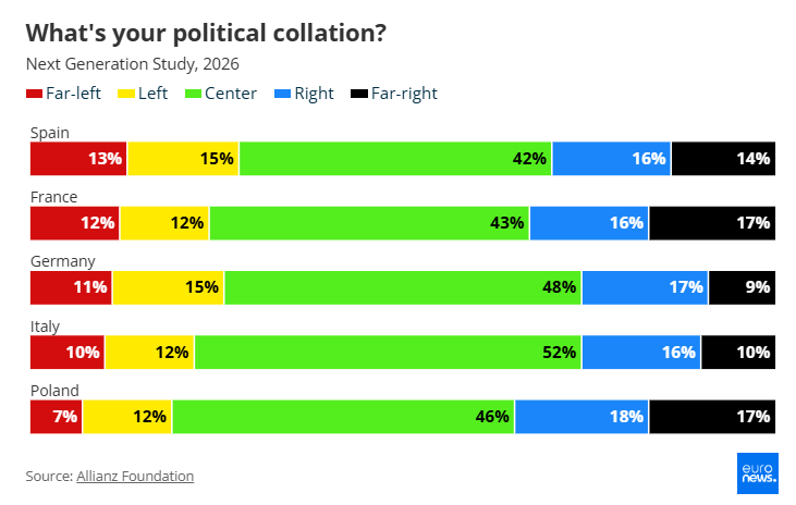 Η Ισπανία ξεχωρίζει ως η πιο αριστερή χώρα μεταξύ των νέων, με το 28% να ταυτίζεται είτε με την αριστερά είτε με την ακροαριστερά.