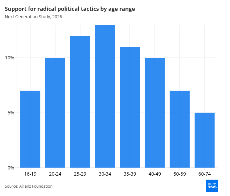 Το 11% υποστηρίζει ριζοσπαστικές πολιτικές τακτικές, συμπεριλαμβανομένης της βίας