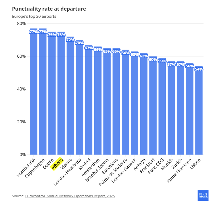 Το ποσοστό των αεροσκαφών που αναχωρούσαν στην ώρα τους έπεσε στο 49%, το χαμηλότερο ποσοστό όχι μόνο μεταξύ των 20 πιο πολυσύχναστων κόμβων της Ευρώπης, αλλά σε ολόκληρη την ήπειρο.