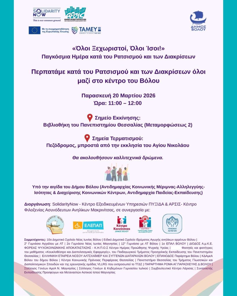 Με μήνυμα Όλοι ξεχωριστοί, όλοι ίσοι, συμβολικός περίπατος για την Παγκόσμια Ημέρα κατά του Ρατσισμού και των Διακρίσεων θα πραγματοποιηθεί την Παρασκευή 20 Μαρτίου 2026, στις 11:00, στο κέντρο του Βόλου, με σημείο εκκίνησης τη Βιβλιοθήκη του Πανεπιστημίου Θεσσαλίας, στη