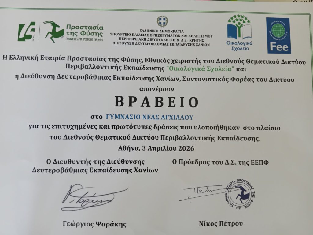 Με τη βράβευσή του ως Οικολογικό Σχολείο επέστρεψε από την Αθήνα το Γυμνάσιο Νέας Αγχιάλου, συμμετέχοντας στο 1ο Φεστιβάλ Οικολογικών Σχολείων που πραγματοποιήθηκε την Παρασκευή 3 Απριλίου 2026. Η σχολική κοινότητα παρέλαβε την Πράσινη Σημαία και το σχετικό βραβείο, ως αναγνώριση των σταθερών και πολυετών περιβαλλοντικών δράσεων που αναπτύσσει.