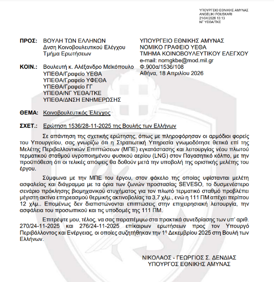 Ερωτήματα για την εκτίμηση κινδύνου από τον βουλευτή Μαγνησίας του ΣΥΡΙΖΑ Αλέξανδρο Μεϊκόπουλο– ανοιχτό το ζήτημα ολοκληρωμένης αξιολόγησης ασφάλειας Η θετική γνωμοδότηση της Στρατιωτικής Υπηρεσίας για το σχεδιαζόμενο LNG στον Παγασητικό, όπως προκύπτει από την