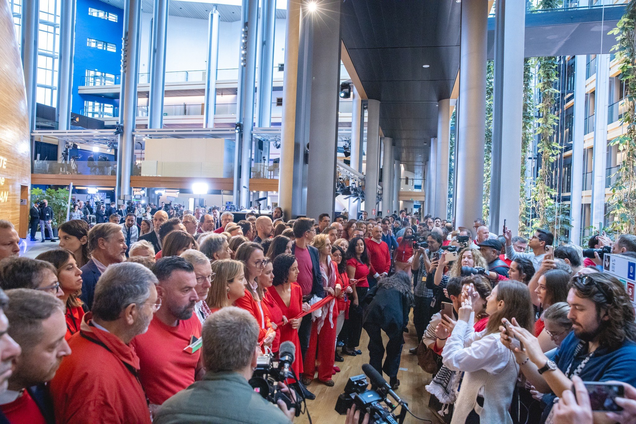 Οι ευρωβουλευτές της Αριστεράς, των Πρασίνων και των Σοσιαλιστών ντύθηκαν στα κόκκινα και σχημάτισαν μια κόκκινη γραμμή έξω από την αίθουσα της Ολομέλειας διαμαρτυρόμενοι για τη γενοκτονία στη Γάζα.