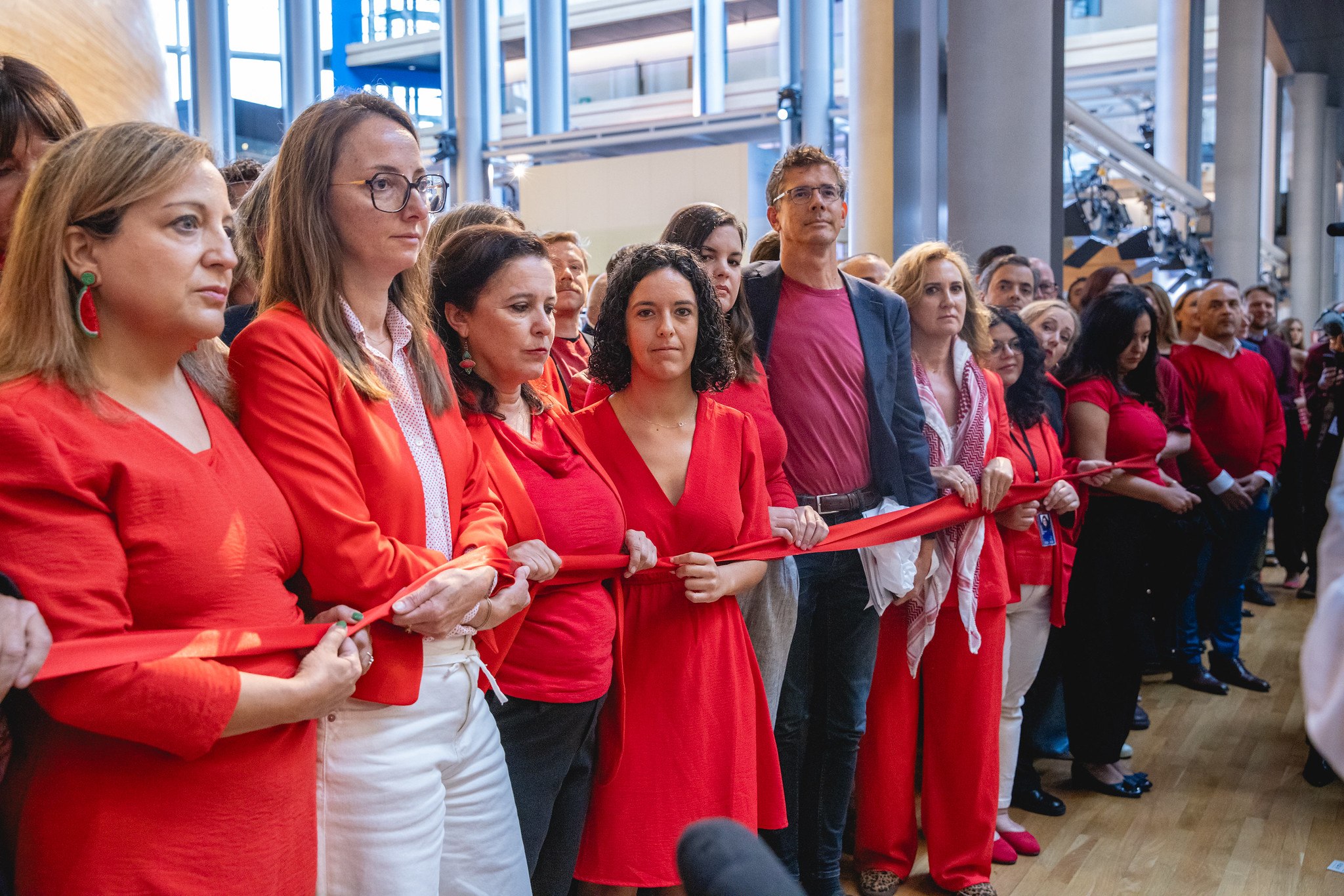 Οι ευρωβουλευτές της Αριστεράς, των Πρασίνων και των Σοσιαλιστών ντύθηκαν στα κόκκινα και σχημάτισαν μια κόκκινη γραμμή έξω από την αίθουσα της Ολομέλειας διαμαρτυρόμενοι για τη γενοκτονία στη Γάζα
