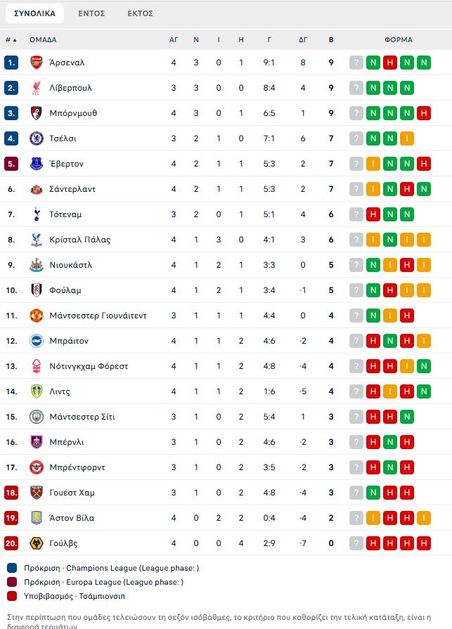 Εξάλλου με αυτογκόλ του Γκούντμουνσον στο 90+4 η Φούλαμ νίκησε με 1-0 τη Λιντς ενώ στο 0-0 έμειναν η Κρίσταλ Πάλας με τη Σάντερλαντ και η Έβερτον με την Άστον Βίλα. Η τελευταία μάλιστα έχει μόλις δύο βαθμούς μετά από τέσσερις αγωνιστικές.