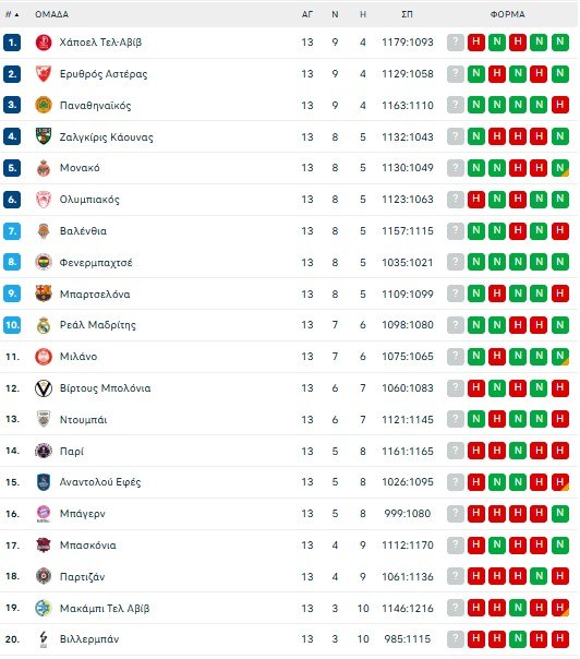 Πώς διαμορφώθηκε η βαθμολογία στην Ευρωλίγκα μετά την ολοκλήρωση της 13ης αγωνιστικής.