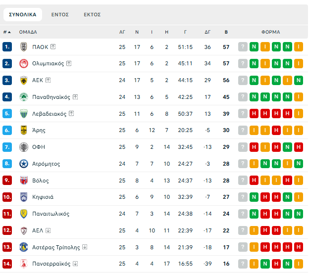 Πώς διαμορφώθηκε η βαθμολογία της Super League μετά τη νίκη του ΠΑΟΚ απέναντι στον Λεβαδειακό. Αποτελέσματα και επόμενη αγωνιστική. Ο ΠΑΟΚ επικράτησε εύκολα του Λεβαδειακού στην Τούμπα με 3-0 για την 25η αγωνιστική της Super League και με 57 βαθμούς έπιασε στην κορυφή τον Ολυμπιακό, ο