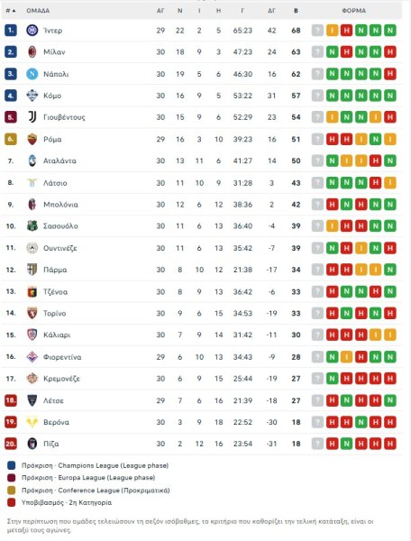 Εκανε το καθήκον της η Αταλάντα απέναντι στην ουραγό Βερόνα καθώς νίκησε 1-0 και επέστρεψε στις νίκες μετά από τρεις αγωνιστικές. Παράλληλα, παραμένει μια ανάσα από θέση που οδηγεί στην Ευρώπη, καθώς είναι 7η με 50 βαθμούς, έναν βαθμό πίσω από την Ρόμα που έχει ένα παιχνίδι λιγότερο καθώς υποδέχεται (19:00) την Λέτσε και βρίσκεται στην έκτη θέση με 51 βαθμούς η οποία οδηγεί στο Conference League.