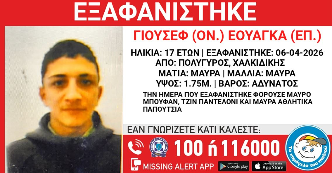Ο 17χρονος εξαφανίστηκε τις πρωινές ώρες της 6ης Απριλίου καιτο Χαμόγελο του Παιδιούπροχώρησε άμεσα σε δημοσιοποίηση των στοιχείων του, κατόπιν εισαγγελικής εντολής, καθώς ενδέχεται να συντρέχουν λόγοι οι οποίοι θέτουν την ζωή του σε κίνδυνο.