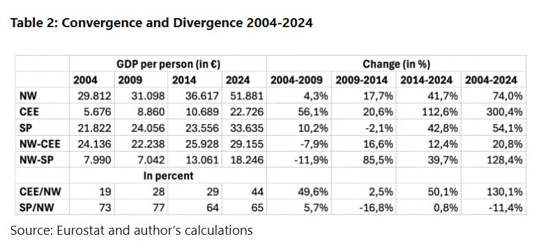 Όπως δείχνει η τελευταία στήλη, το μέσο κατά κεφαλήν ΑΕΠ της Κεντρικής και Ανατολικής Ευρώπης αυξήθηκε κατά περίπου 300%, φθάνοντας το 44% του επιπέδου του πλούσιου βορειοδυτικού τμήματος το 2024, σε σύγκριση με το 19% το 2004.