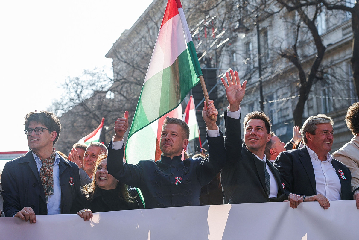 Ο Πέτερ Μαγιάρ, ηγέτης του κόμματος της αντιπολίτευσης Τίσα, κρατά μια εθνική σημαία καθώς συμμετέχει σε πορεία στο πλαίσιο των εορτασμών της Εθνικής Εορτής της Ουγγαρίας, η οποία τιμά επίσης την Ουγγρική Επανάσταση του 1848 κατά της κυριαρχίας των Αψβούργων, στη Βουδαπέστη της Ουγγαρίας, στις 15 Μαρτίου 2026. REUTERS/Bernadett Szabo