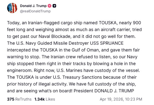 Σε ανάρτησή του, οΝτόναλντ Τραμπανέφερε ότι το φορτηγό πλοίο TOUSKA, μήκους σχεδόν 274 μέτρα και βάρους σχεδόν όσο ένα αεροπλανοφόρο, επιχείρησε να περάσει τον ναυτικό αποκλεισμό που έχει επιβληθεί από τις ΗΠΑ.