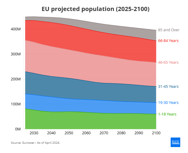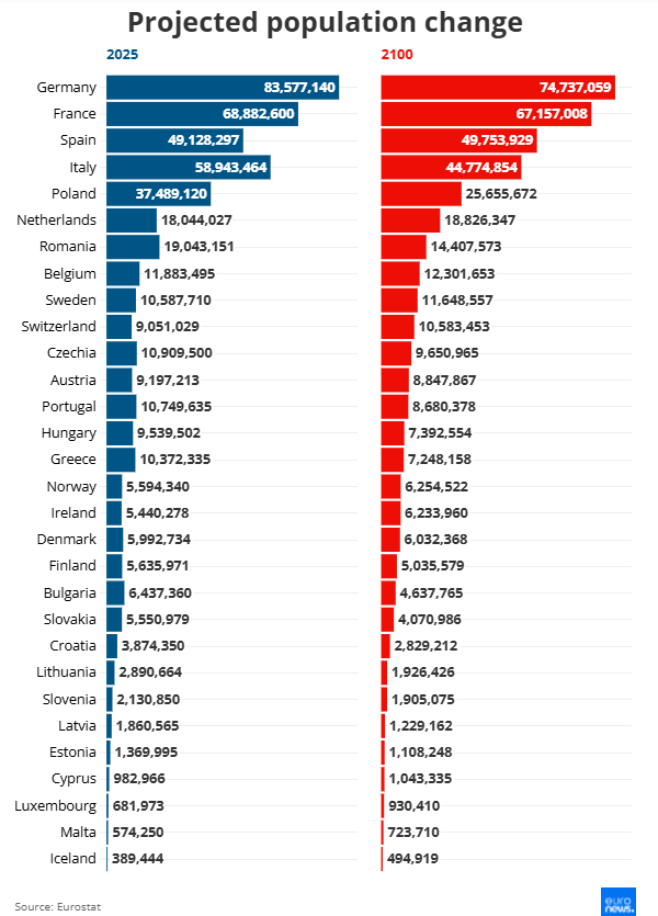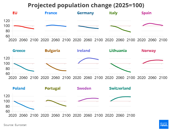 Σύμφωνα με τις τελευταίες προβλέψεις της Eurostat, ο πληθυσμός της Ευρωπαϊκής Ένωσης αναμένεται να μειωθεί κατά περίπου 11,7% μεταξύ 2025 και 2100. Αυτό σημαίνει ότι από τα 452 εκατομμύρια κατοίκους σήμερα, η ΕΕ θα φτάσει περίπου τα 399 εκατομμύρια στο τέλος του αιώνα.
