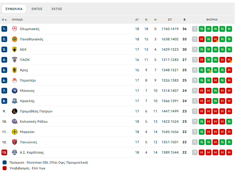 Υπενθυμίζουμε ότι ο Ολυμπιακός βρίσκεται στην πρώτη θέση της βαθμολογίας, έχοντας το απόλυτο σε 18 αναμετρήσεις, ενώ στη δεύτερη θέση είναι ο Παναθηναϊκός με 15/3, με τους Ερυθρόλευκους ουσιαστικά να έχουν κλειδώσει το πλεονέκτημα της έδρας στα πλέι οφ.